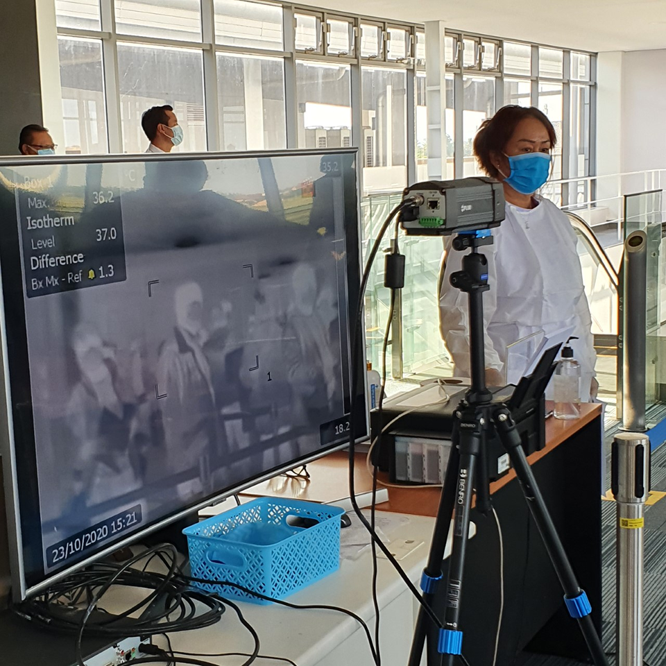 20201120-covid-19-air-travel-thermal-scanner Thermal scanners are installed to monitor the body temperatures of arriving passengers.